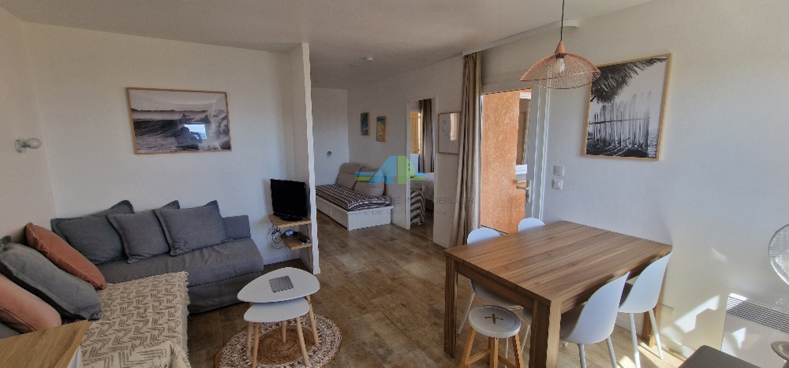 il se compose : entrée avec 1 lit d'appoint 1 personne , 1 chambre (1 lit 2 personnes), coin salon repas , cuisine ouverte ( convertible 2 personnes)